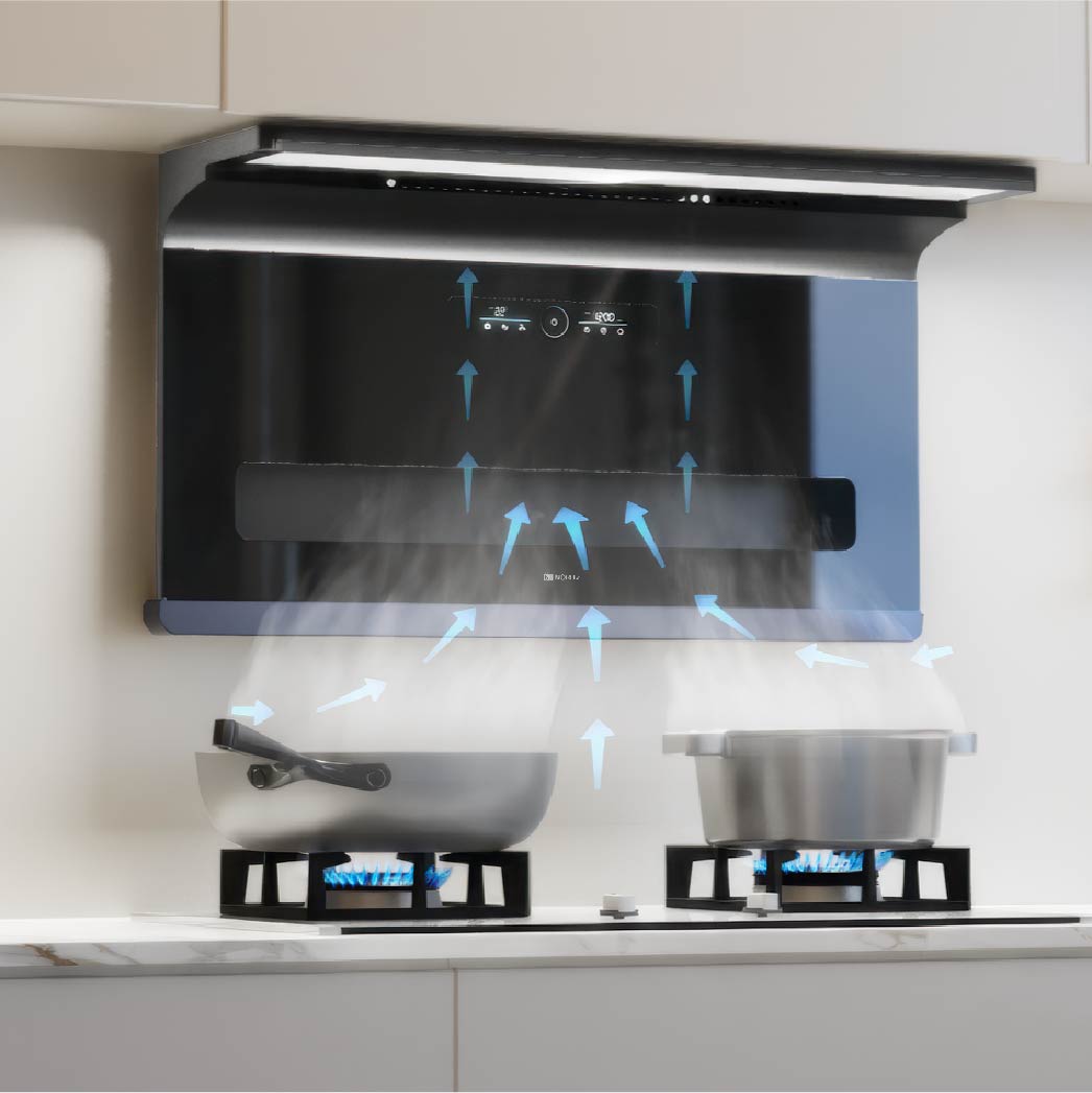 เพิ่มพลังการดูดด้วยช่องดูดแบบคู่ช่วยขจัดควันและละอองน้ำมันได้อย่างมีประสิทธิภาพรุ่นบางเฉียบที่โดดเด่นด้านดีไซน์